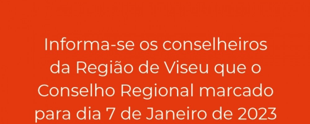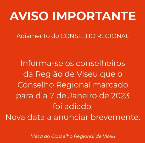 Informa-se os conselheiros da Região de Viseu que o Conselho Regional marcado para dia 7 de Janeiro de 2023 foi adiado, nova data a nunciar brevemente.