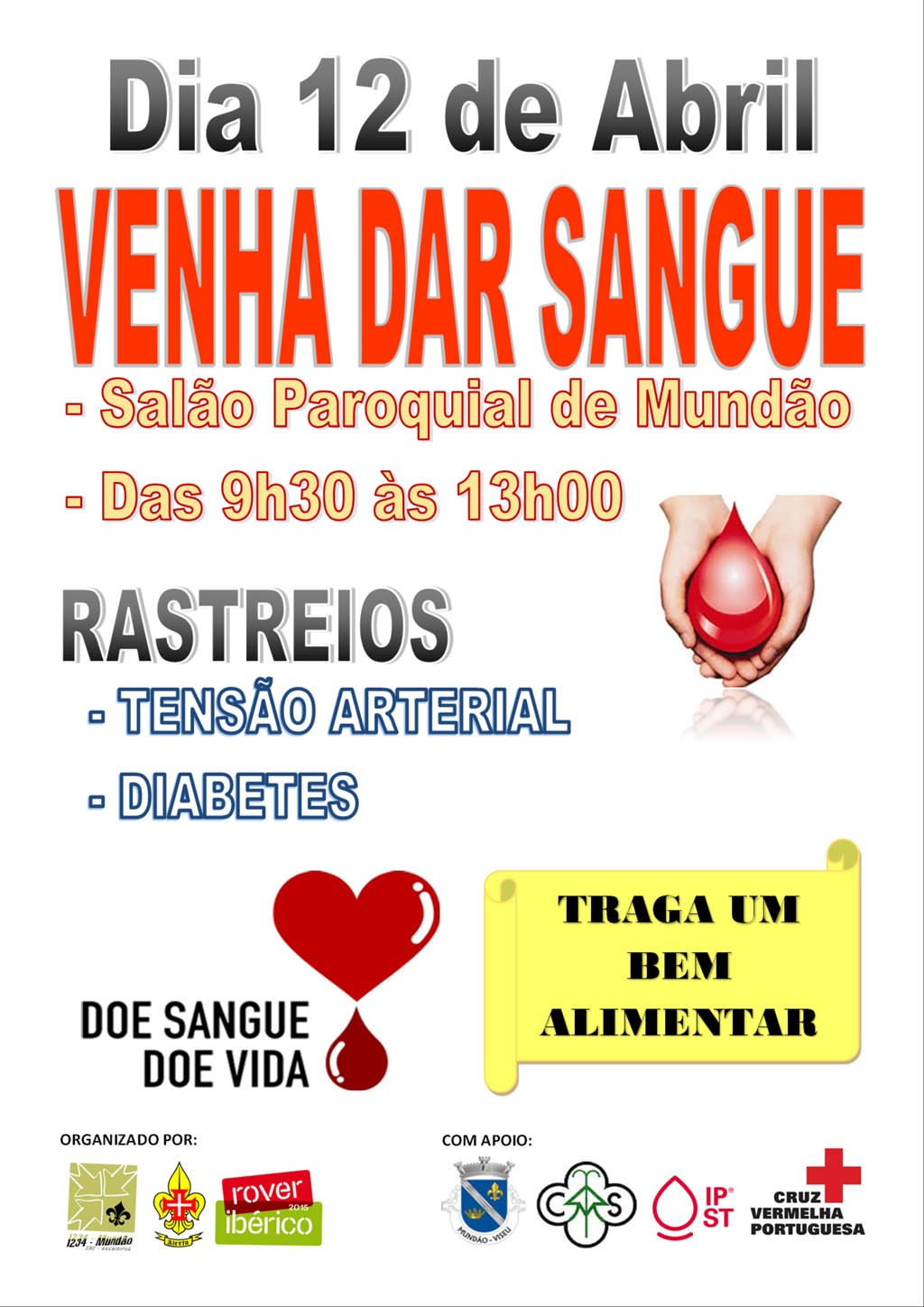 O agrupamento 1234 - Mundão, na sequência do projeto elaborado pelos seus Caminheiros, para a atividade "Rover Ibérico 2015", irá promover uma "Dávida de sangue", a realizar-se no próximo Domingo, dia 12 de Abril entre as 9h30 e as 13h no salão paroquial de Mundão.